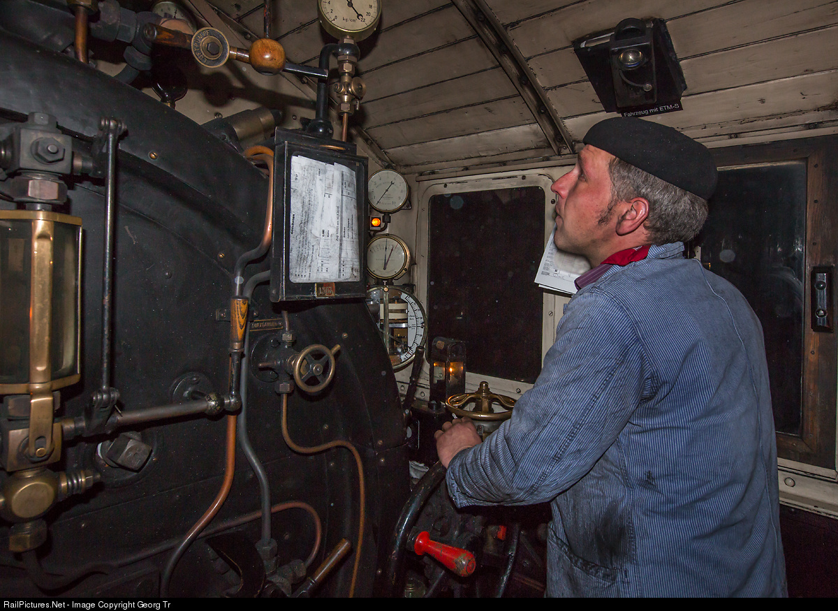 | In the cab of steamlocomotive B 3/4 # 1367 of SBB Historic in Brugg (AG) on the run through the 15 kilometer long Gotthard tunnel from Göschenen to Airolo. The locomotive is running with 70 km/h, but driver Stefan has not so much to do, because she is pulled by Ae 6/6 # 11411 (compulsory through this tunnel). Nevertheless, the controller had to be operated for lubricating steam, the steam pressure has to be under control or there is water to feed into the boiler etc. |