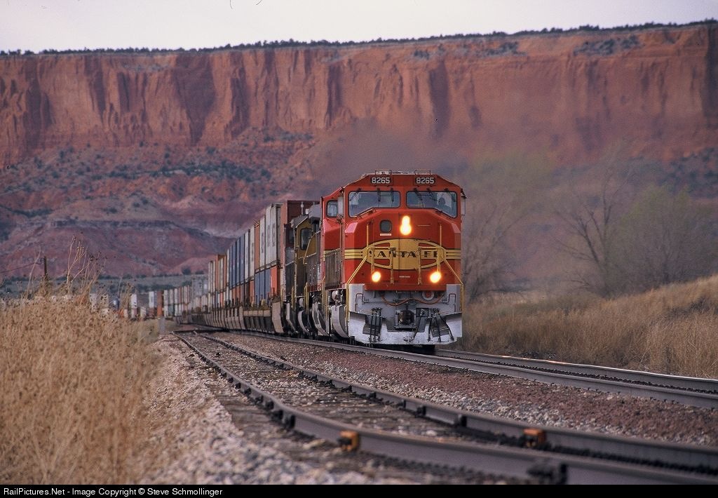 | Brand-new Santa Fe SD75M 8265 leads an eastbound intermodal train at North Guam, New Mexico with the famouns red sandstone cliffs in the distance. |