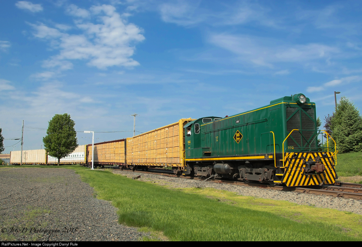 | SMS Baldwin DS4-4-750 #102 shoves a cut of 4 lumber cars down a siding in the Morrisville Industrial Park on a picture perfect Spring morning in Lower Bucks County, PA. This unit was originally Youngstown Steel #701, then went to the Pickens RR in South Carolina before coming to the SMS. |