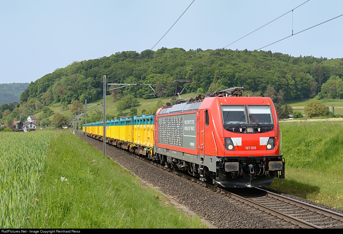 | 187 009 from Bombardier, leased by Swissrailtraffic, heads a rake of container cars loaden with toxic material from hazardous waste site Kölliken to Niederglatt. |