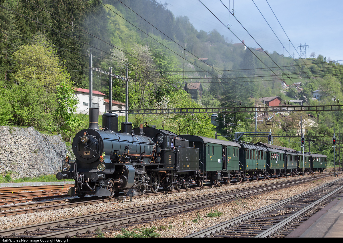 | The steam train with B 3/4 # 1367 (2-6-0 Mogul), a 3 axle baggage and 5 twoaxle passenger cars entering Gurtnellen station on the Gotthard north ramp. This was a pseudo entrance for the passengers of the train. The used coal from Wales/Great Britain, has a very good heat value, but produces nearly no smoke. |