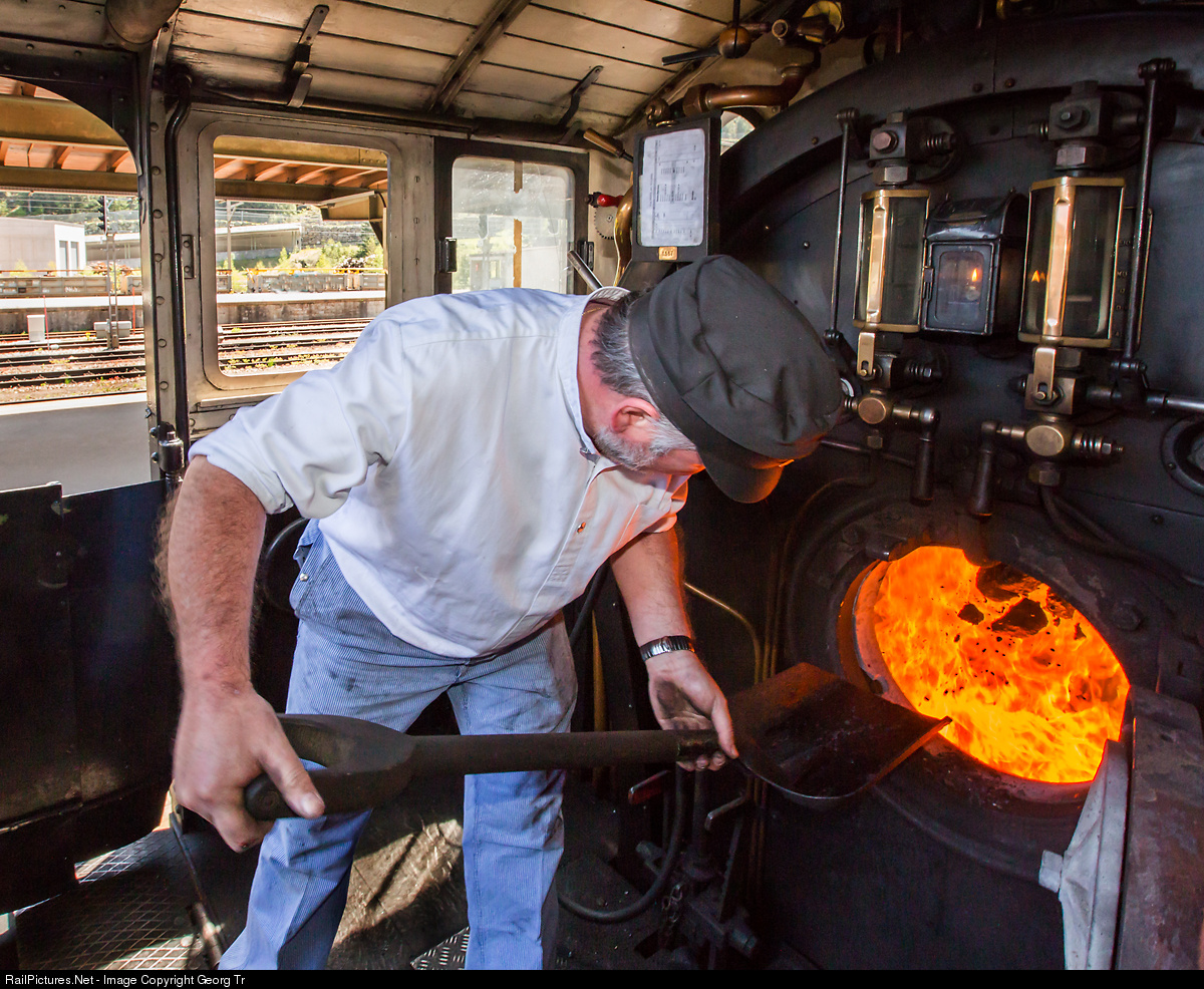 Fireman Peter is throwing some more coal into the firebox of "Mogul" B 3/4 # 1367 before the run through the 15 kilometer long Gotthard tunnel to Airolo, pulled by Ae 6/6 # 11411 from SBB Historic in Erstfeld.