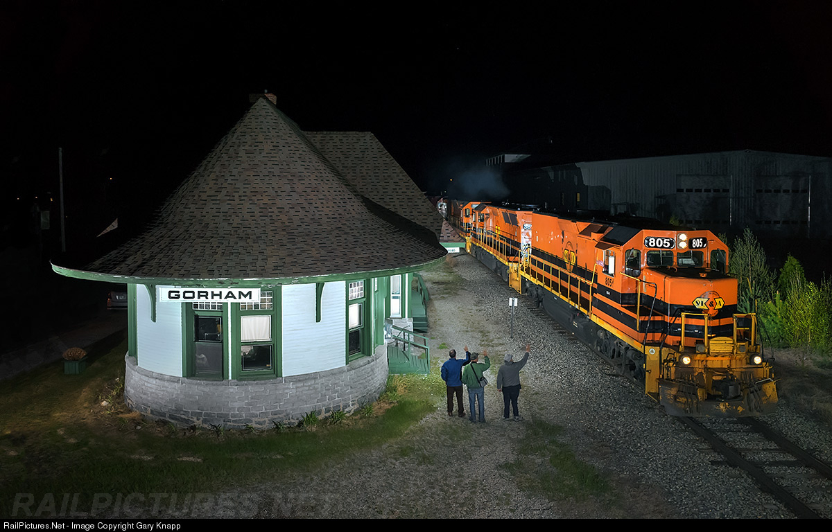 We are in Gorham, NH as SLR 393 behind Road Slug 805 rolls past the photogenic ex-GT station as L to R, Tim Beaulac, Richard Berlanger and Don Provencher exchange waves with the engineer at 22:26. Gorham only sees trains four nights a week these days so this moment was cause for celebration by all involved!