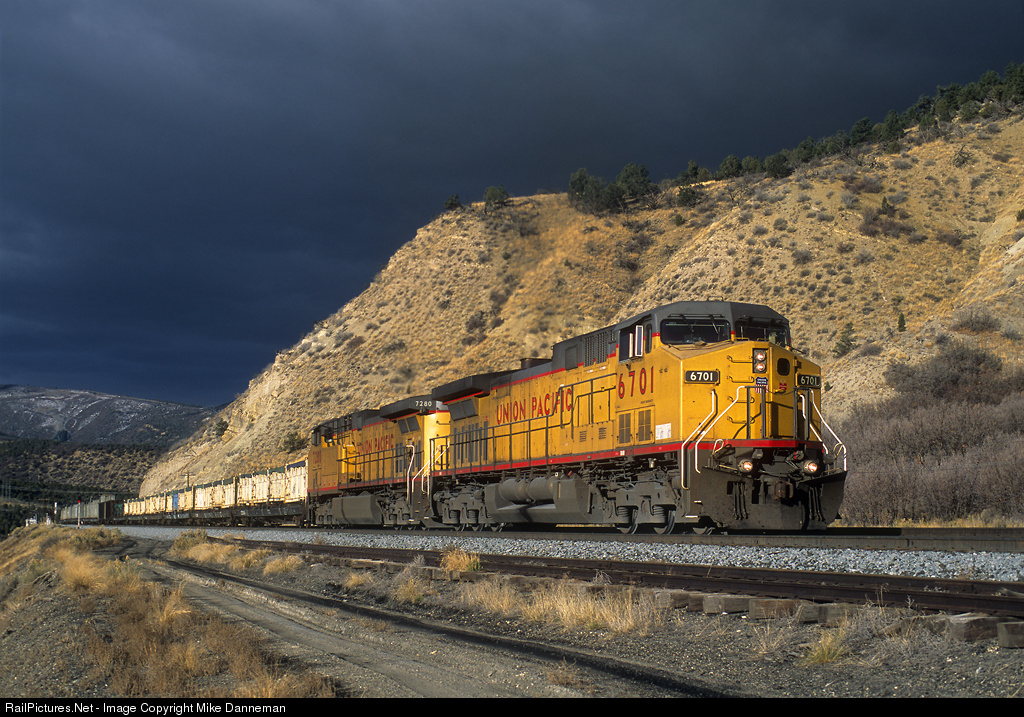 With stormy weather surrounding Soldier Summit, Union Pacific’s “dirt train” LJP44 hauling contaminated dirt and trash from Salt Lake City to Helper, climbs the grade through Gilluly, Utah, on November 21, 2003.