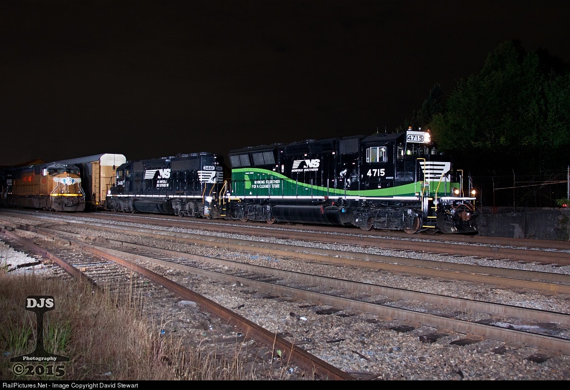 | NS GP33ECO NÂș4715 leads a SD40-2 on GE24 as it makes it's way by Industry Yard in East Point, Georgia on the morning of May 17,2015. 4715 was originally built as Southern Railway (CNOTP) GP50 7055 in October 1980, the unit was rebuilt and released from Altoona in January 2015. |