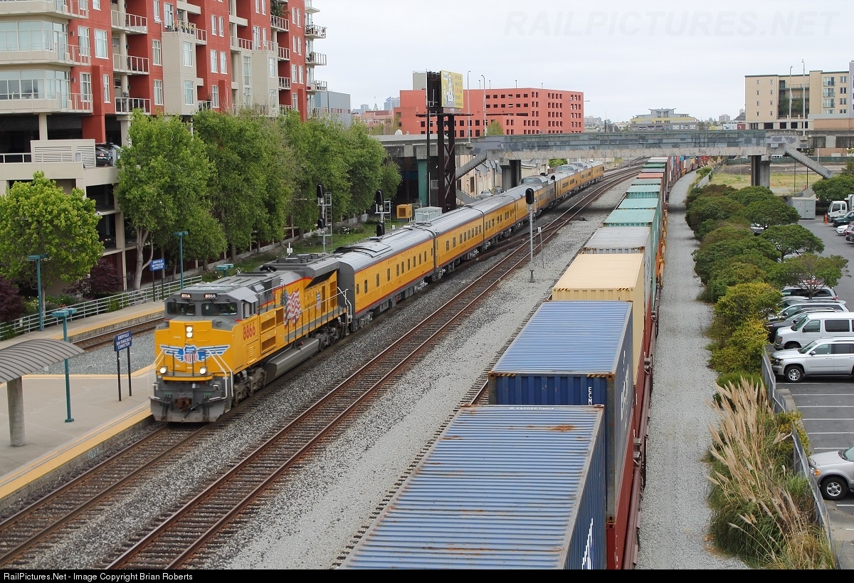 | To commemorate 150 years since the Chinese railroad workers helped build the transcontinental railroad, Union Pacific ran a special passenger train from Oakland to Reno over the very pass that the Chinese helped build. Leading this 8 train special is an SD70ACe. The special passes the Emeryville Amtrak station while a K-train from Oakland sits waiting to leave. |