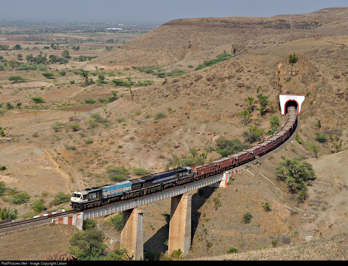 EMD-WDG-4 pair leads a hopper rake consisting fresh ballast, out of tunnel number 1 in Shindavane.