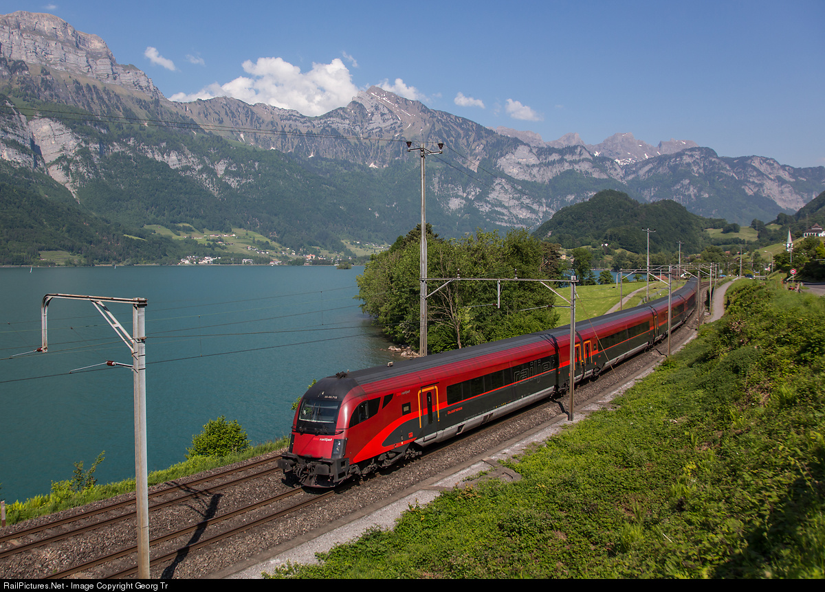 RailJet # 162 Wien Westbahnhof-Zürich with leading cab car # 715 and locomotive 1116 shoving in the rear is running along the Walensee near Mols.