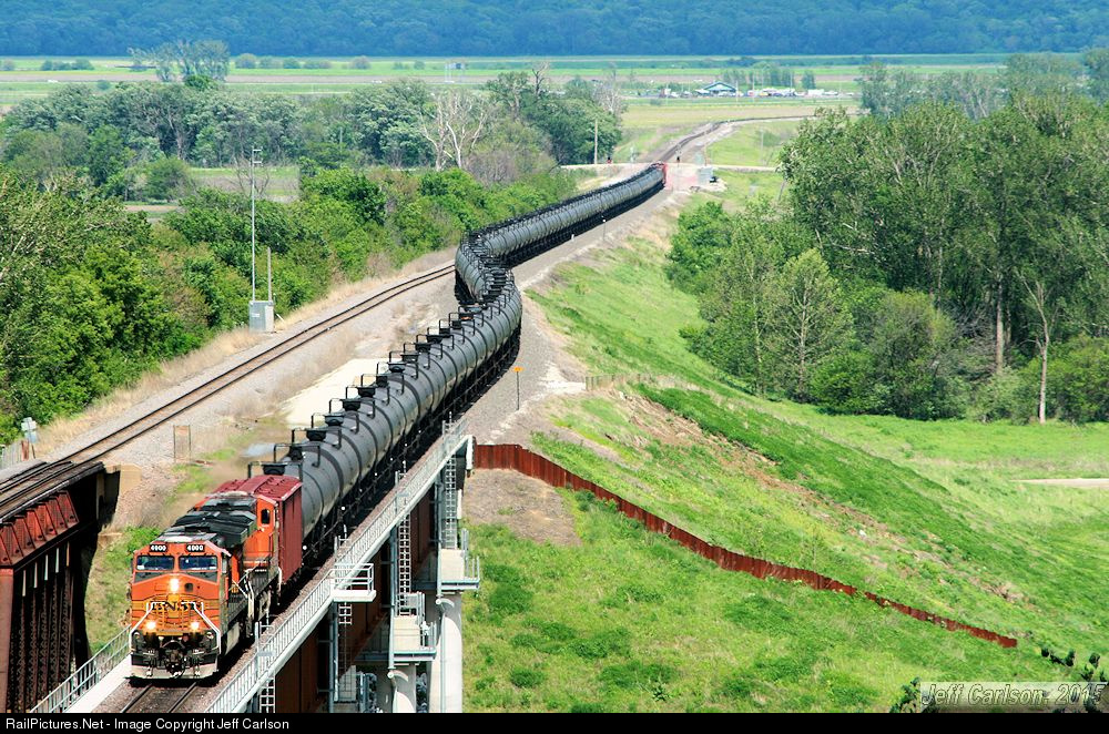 BNSF 4000 West leads a westbound oil train across the new bridge over the Missouri River at Plattsmouth, NE. This train had come north on the St. Joe Sub and turned west at Pacific Jct. in Iowa, which is amazingly visible in the background, some 4 miles east of here. Of note, the 4000 had been involved in a 2012 oil-based wreck, but in this case it struck a truck full of it, and the results can be seen here: http://bnsfsd70.rrpicturearchives.net/showPicture.aspx?id=3189331