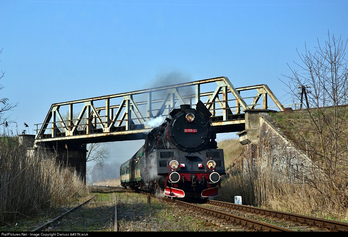 Steam loco Ol49-59 with one of the last plan trains with steam locomotives, number KW77428 from Wolsztyn to Leszno. Over train there are a bridge on the line number 357 form Sulechów throgh Wolsztyn to Luboń near Poznań, and on the left there are close line from Wolsztyn to Nowa Sól.