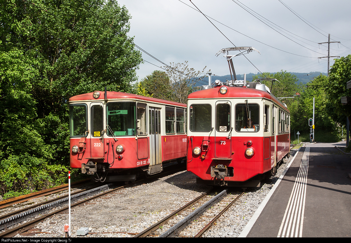 Electric cogwheel railcar BDeh 2/4 # 73 of the former Chemins de fer électriques Veveysans (CEV), now Transports Montreux-Vevey-Riviera (MVR), on the way to Les Pléiades on a photo run, is crossing the timetabled train with BDeh 2/4 # 74 with cab car Bt # 222 in Les Chevalleyres between Blonay and Les Pléiades.