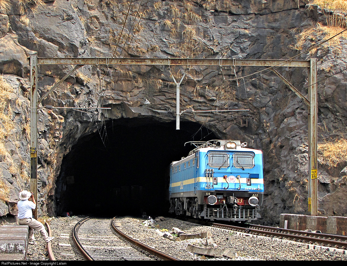 | WAG-7 class, 5000 HP , AC , Goods service locomotive of Indian railways, exits out of double line tunnel in Bhor ghat. |