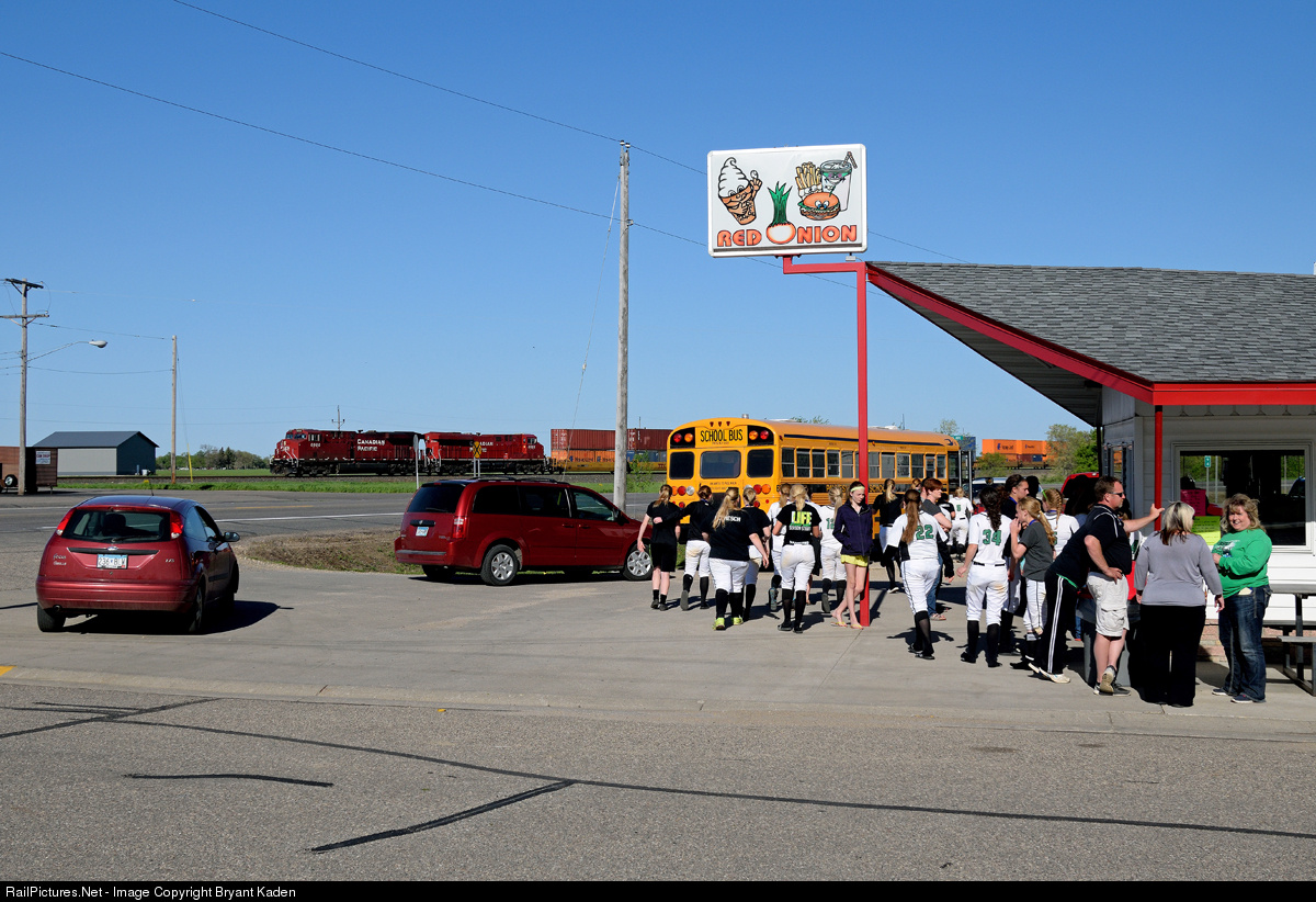 An area high school softball team has stopped for a celebratory treat at the locally famous Red Onion as CP keeps intermodal traffic moving through town toward Vancouver.