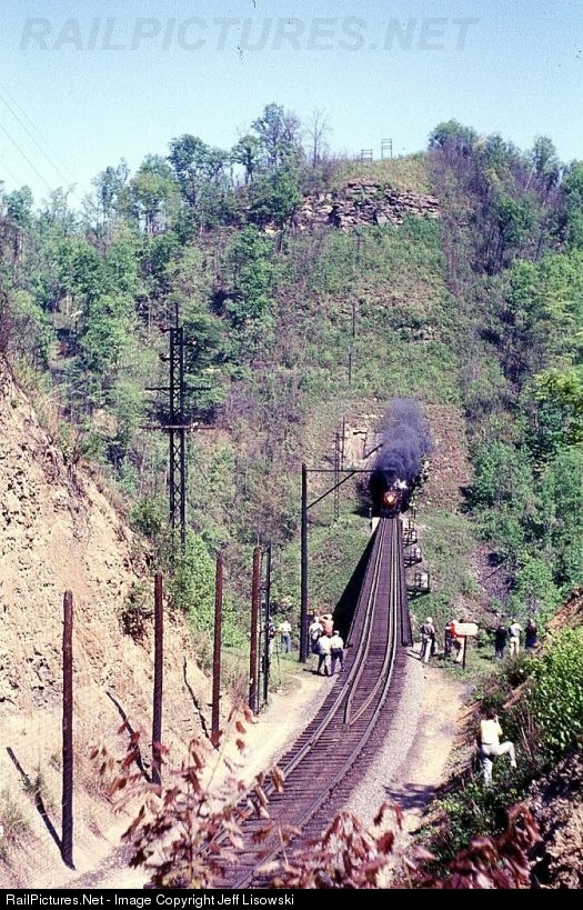The 1957 NRHS convention was one for the history books. What, with excursions pulled by K's, A's, Y's, Ms, E's and even some Virginian power, what railfan could ask for any more? Here, at the remote Hamilton Trestle, the regularly scheduled train #5 from Bluefield, WVa to Norton, Va performs a photo runby coming out of the Holbrook tunnel. An extra E-class Pacific was added for the additional coaches for convention goers. Thank you to Steve Patterson (who was to the right of this photographer) for clarifying some information.