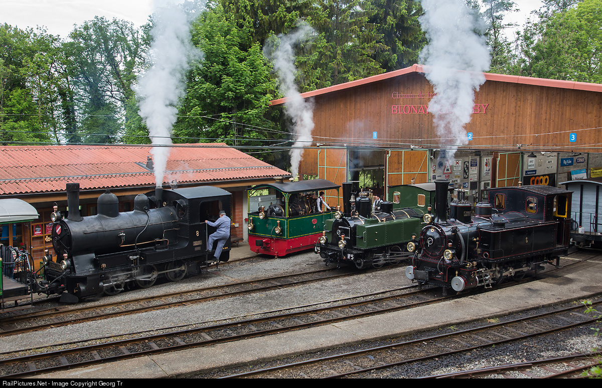 G 3/3 # 8 (left) of the Lausanne-Echallens-Bercher Railway (LEB) is a guest on the Blonay-Chamby this days, she was built by SLM in 1910. Streetcar locomotive G 2/2 # 4 is from the Ferrovie Padane in Italy. G 3/3 # 5 of the Lausanne-Echallens-Bercher Railway (LEB) is 125 years old now (built in 1890 by Grafenstaden/Alsace/France) and it is the first day that she is operational again since many years. G 3/3 # 6 comes from the Bière-Apples-Morges Railway (BAM) and was built in 1901 by SLM Winterthur.