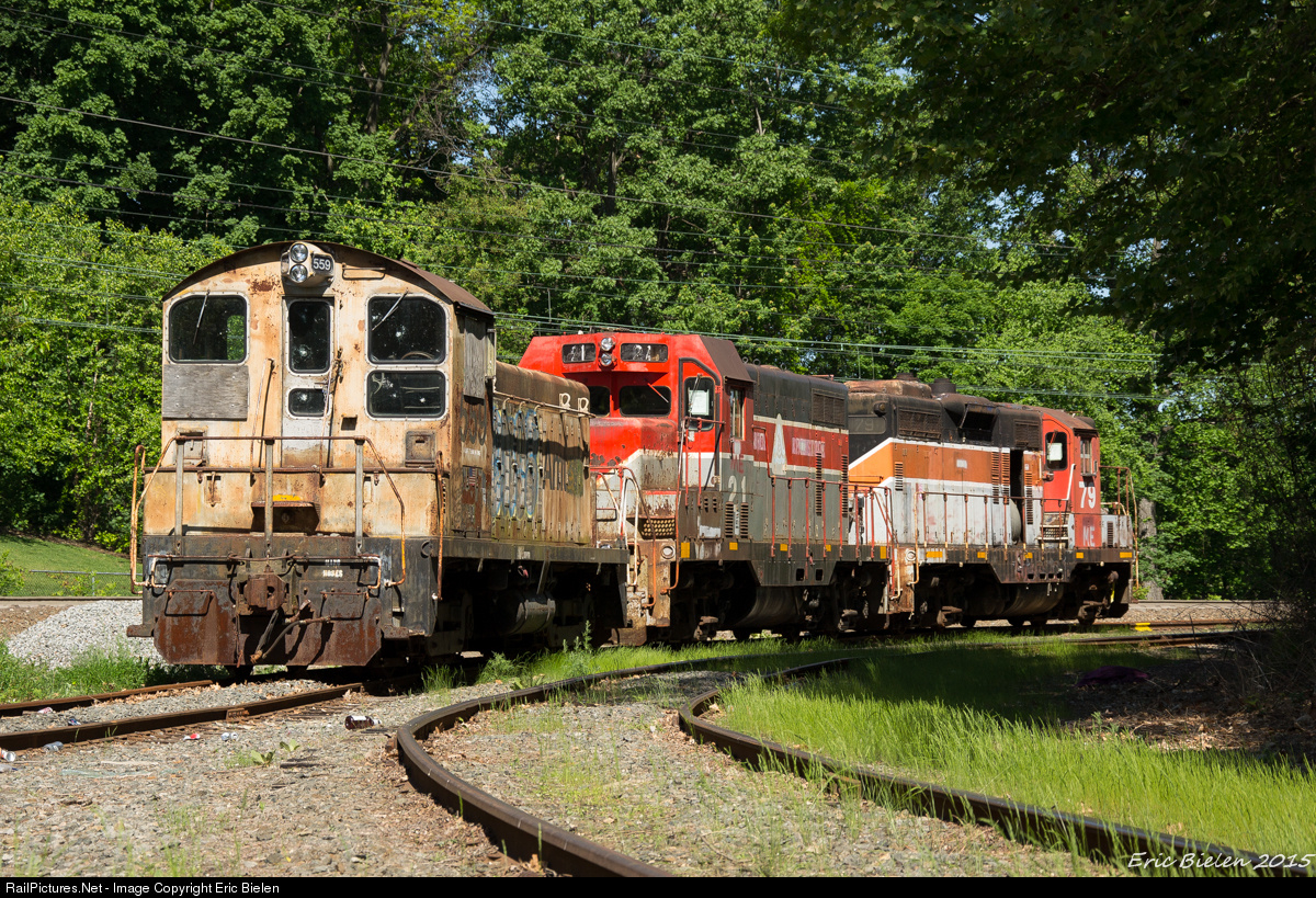 | Stored power sits on Morristown & Erie's storage track. The pair of geeps in back (GP7u & high-hood GP9) are former Bangor & Aroostook units that were purchased from the MMA auction in August of last year. The switcher in front is former Amtrak 559. It was built for Santa Fe in 1953 as an SW9. It was rebuilt by ATSF as an SSB1200 and later made its way to Amtrak where it was used to switch the Washington DC coach yard. |