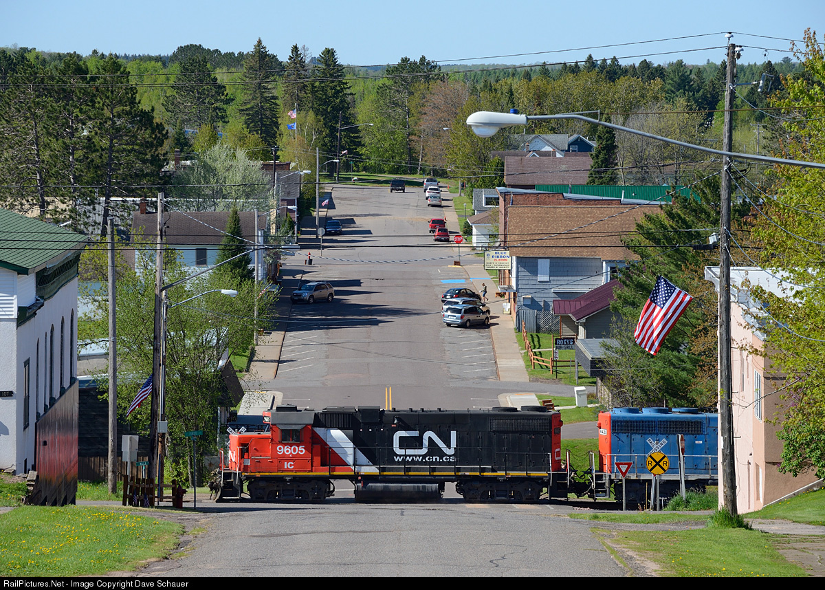 | Like many towns across the country as Memorial Day approaches, Glidden placed American flags throughout their community as a shown of respect for those who died serving in the Armed Forces. At least five flags can be seen in this shot as CN's Ashland Local heads through town on its way south with 22 loaded log racks. |