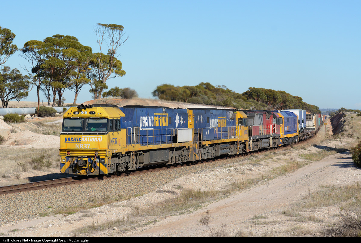 | The Spencer Junction-bound 7PX4 steel train emerges out of a cutting near Tammin in the Western Australian wheatbelt with locos NR37 & NR104 leading and MRL002 & 8121 dead hauled for transfer east. |