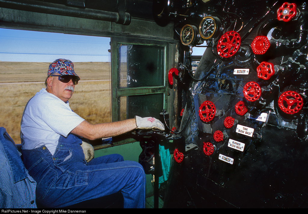 Fireman Jack Wheelihan watches and converses (more like yells) with Engineer Steve Lee on Union Pacific Challenger No. 3985 as it approaches Egbert, Wyoming, on September 23, 2003. The train will be traversing the Yoder Subdivision from Egbert to South Morrill, Nebraska, on the trip east to Omaha.