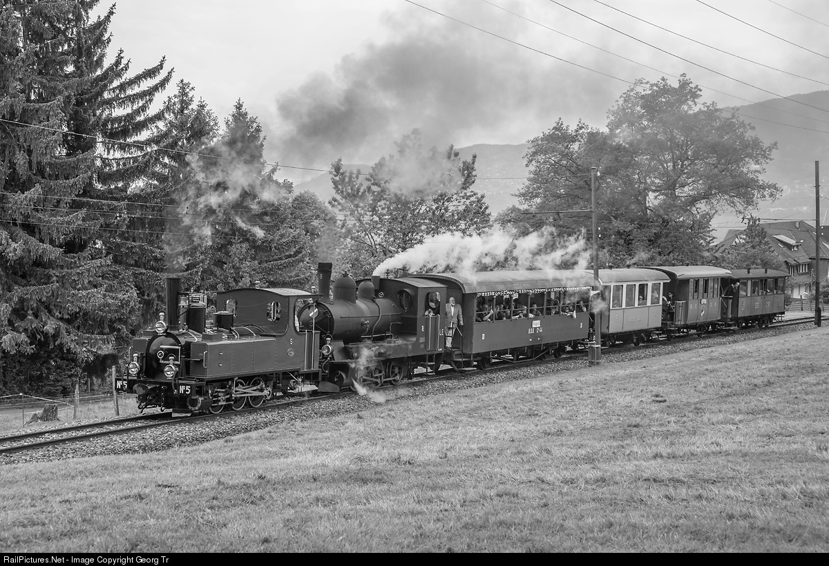 | G 3/3 # 5 and 8 of the Lausanne-Echallens-Bercher Railway (LEB) with train 5847 from Blonay to Chamby musée on the 5.0 % grade near Chaulin. # 3 from 1890 is with the Blonay-Chamby Railroad and operational again since two days, # 8 from 1910 came as guest locomotive from the LEB for the Pentecost weekend on the Blonay-Chamby. |