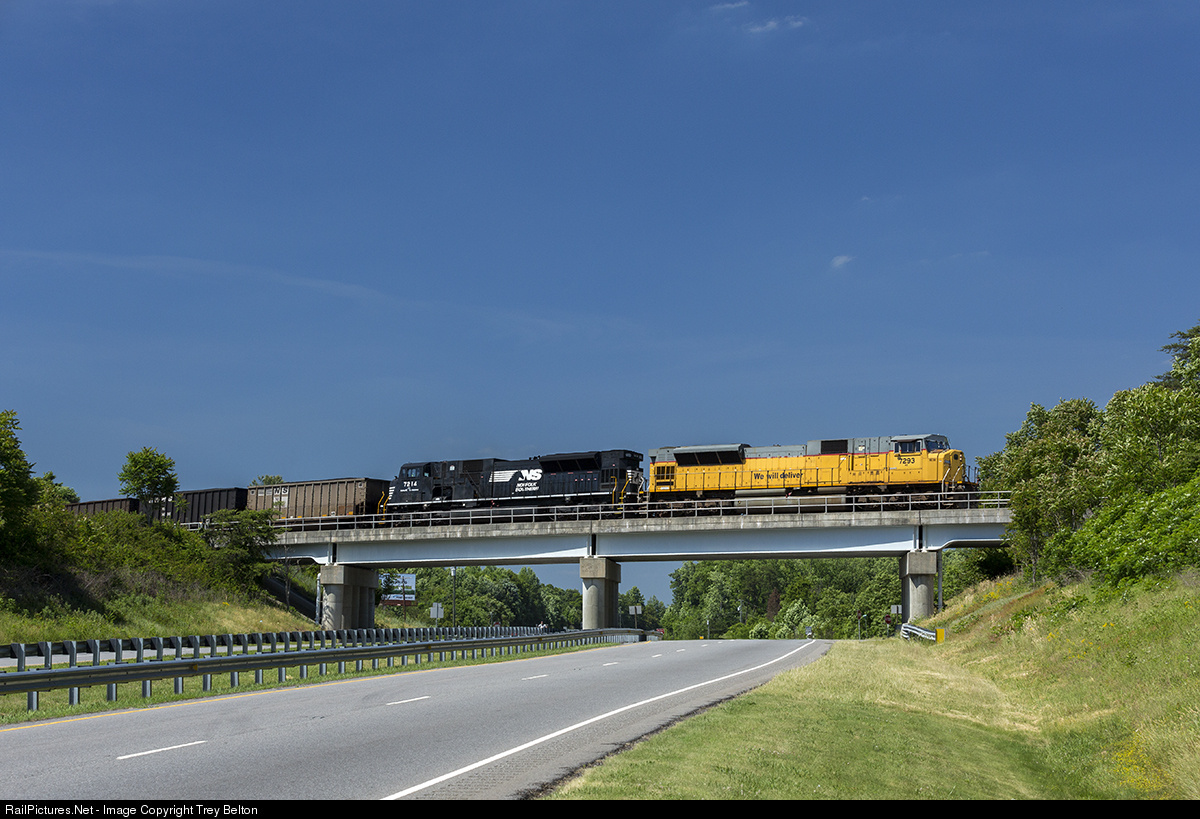 Former Ex UP SD90MAC 7293 and SD80MAC 7214 lead the 746 south over US 220 through the Price community.
