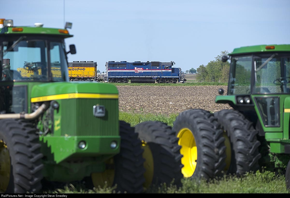 While nothing might run like a Deere, the Illinois Railway's Zearing Job makes a leisurly shove to the BNSF interchange at Zearing, Illinois with eleven cars for interchange. Lead GP35 3500 is the only locomotive on the former Illinois RailNet's eclectic roster that sports a sharp paint scheme. The former Southern Pacific unit is shown on Wednesday, May 13, 2015.