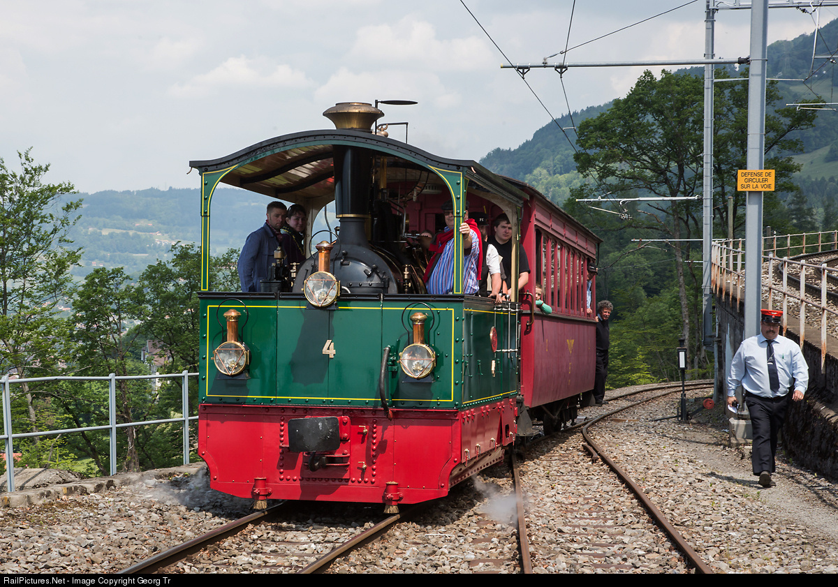 Streetcar steamlocomotive G 2/2 # 4 "Rimini" of the Ferrovie Padane/Italy, built in 1900 by Krauss/Germany, entering Chamby station with car B # 7 of the Nyon-St-Cergue-Morez (NStCM), with train 427 from Blonay. # 4 ran on the line Ferrara-Podigoro first, later between Rimini and Novafeltria.