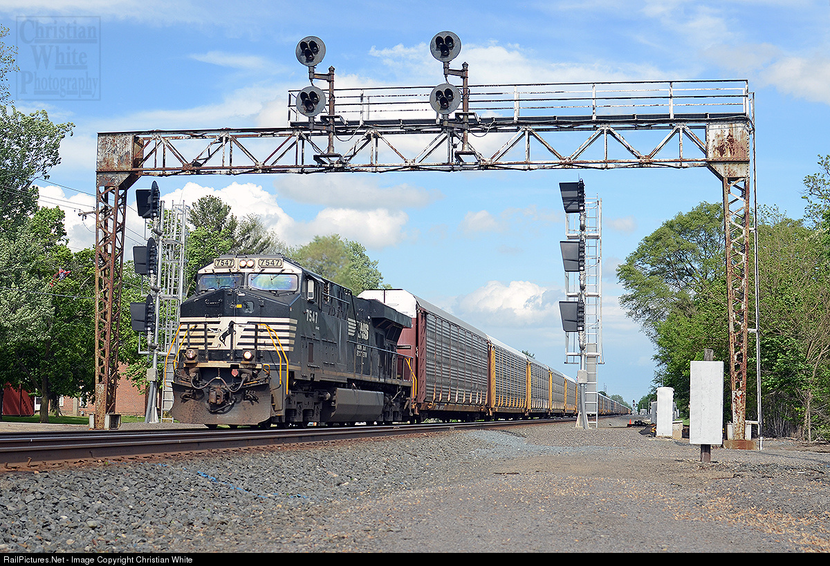 | NS 7547 pulls a loaded autorack train under the soon to be cut over NYC signal bridge in Waterloo, Indiana. |