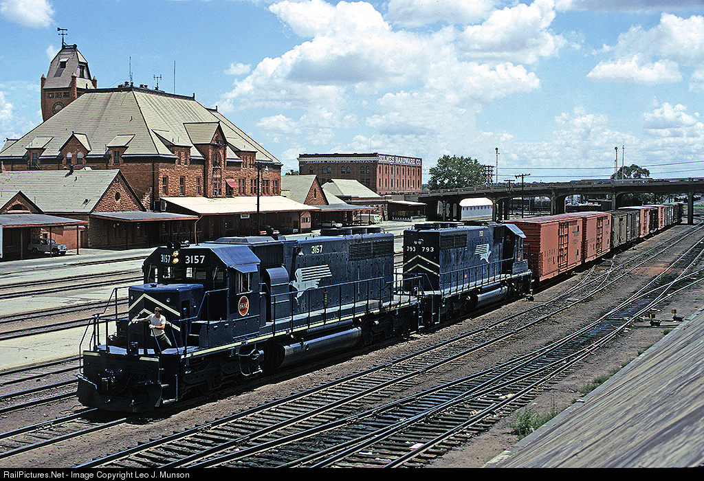 | A Missouri Pacific train, led by Chicago & Eastern Illinois SD40-2 3157 and MP SD40-2 793, prepares to depart Pueblo, Colorado, on August 29th, 1974. |