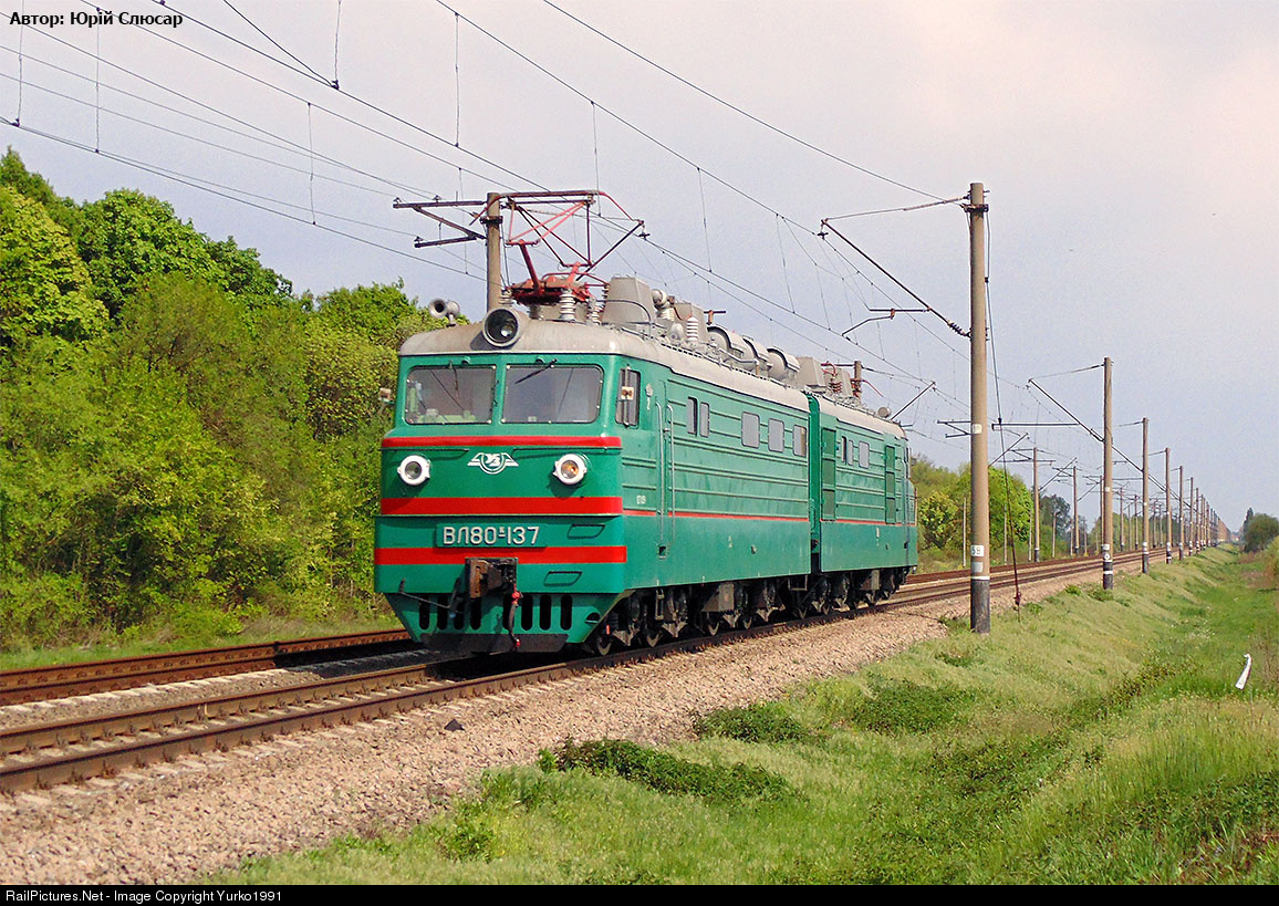 | The freight electric locomotive VL80K-137 going toward the Grebimka station. This electric locomotive built in 1967 on Novocherkassk Electric Locomotive Plant (NEVZ). From the time when this electric locomotive was built, he worked at the depot TCH-3 Kozyatyn (South-Western Railway / Pivdenno-Zahidna zaliznytsya). In december 2009, he was transmitted to depot TCH-12 Grebinka (Southern Railway /Pivdenna zaliznytsya). In august 2014, he was transmitted to depot TCH-6 Kremenchuk (Southern Railway /Pivdenna zaliznytsya). |