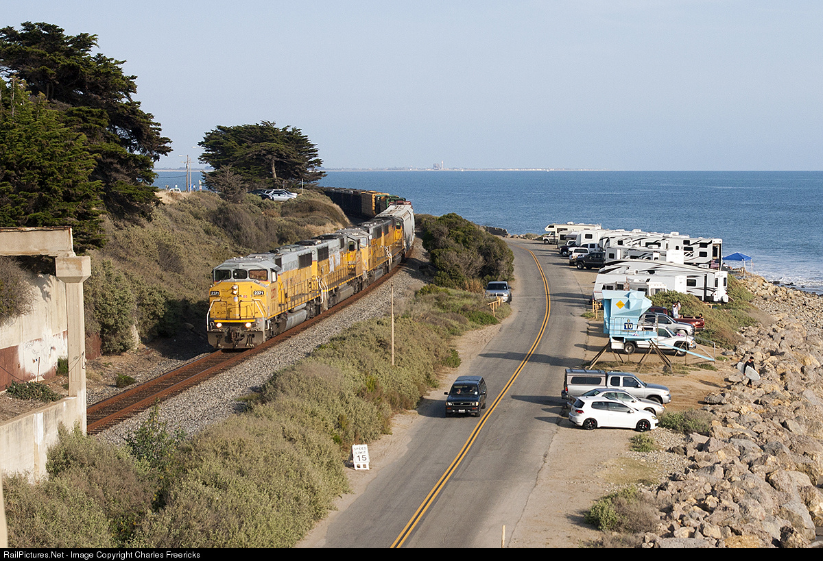 | She'll be coming round the mountain when she comes... The Union Pacific LOF67 (nicknamed the Guadalupe Turn by fans and rails alike) makes its twice weekly appearance heading north through Ventura CA, passing surfers and campers along the coast. |