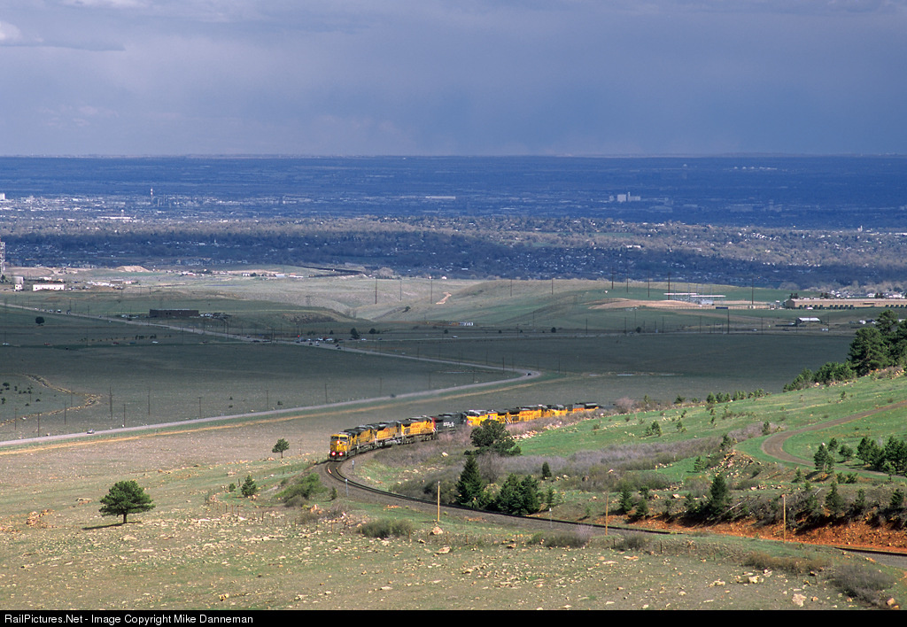 As rainy weather moves east over the plains, a westbound Union Pacific manifest freight curves out of Clay, Colorado, while climbing the front range of the Rocky Mountains on April 18, 2003. Leading the eight locomotive consist is a former Chicago and North Western GE AC4400CW. Directly above this engine in the background is an eastbound UP coal train at Leyden, which this freight met at Rocky.