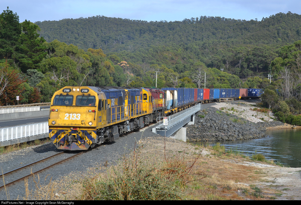 The newly rebuilt rail bridge that crosses the Blythe River at Heybridge sees the 431 Burnie to Boyer paper train speed across it behind MKA2133, MKA2137 & DQ2011.