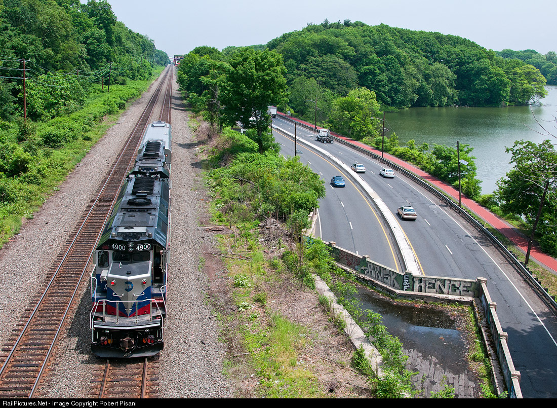 An NJ Transit test train heads east after making a round trip on the Raritan Valley Line. Included in the short consist is MNCW 4906 (GP40PH-2) and a single cab car, NJT 6034, which is leading in this view. Metro-North equipment does not often visit the RVL, but they do occasionally show up on "shakedown" runs such as this. US 22 is unusually quiet during this midday view, and Weequahic Park provides a green background.