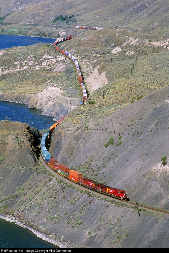 | A westbound Canadian Pacific intermodal train snakes through the curves of Black Canyon, west of Ashcroft, British Columbia, on June 25, 2006. |