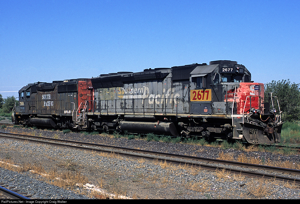 Take notes ... This gets complicated ... A pair of former Southern Pacific diesels are ready for their next assignment in Tucumcari, New Mexico. "South Pacific" 7666 is a GP40-2, but the more interesting unit is Union Pacific 2677: Built in December 1966 as Atlantic Coast Line SD45 1032, it became Seaboard Coast Line 2008 when the ACL and SAL merged. SCL later renumbered it 8908 as part of the Family Lines unified numbering system. It retained the number 8908 when the Family Lines railroads were officially merged into the Seaboard System, and also when SBD merged with the Chessie System roads, making it CSXT 8908. CSX eventually sold it to VMV (where it kept the same number), who unloaded it to MK Rail Corporation. MK rebuilt it as an "SD40M-2," and Southern Pacific acquired it, along with 132 others, in 1993. SP numbered this engine 8601, and with the SP/UP merger in 1996, it became Union Pacific 2677.