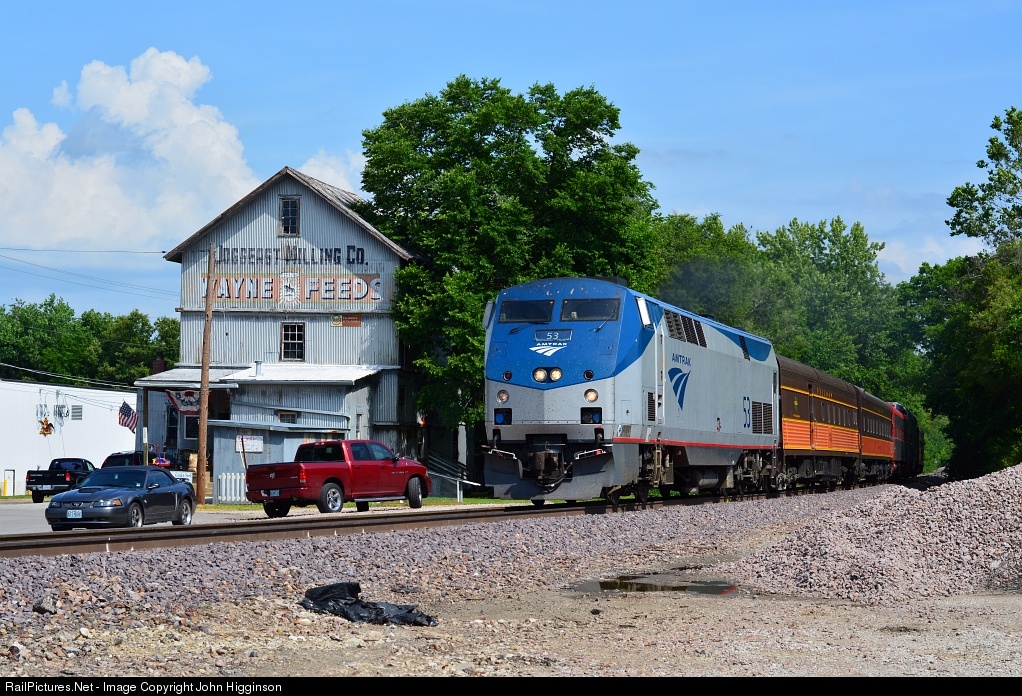 On its way from St. Louis to Memphis, a High Iron Travel rare mileage excursion passes the old feed mill in downtown Imperial on BNSF's River Subdivision, a former Frisco line which sees no Amtrak service. Behind the P42 are four passenger cars from Iowa Pacific's fleet ("Sunset Harbor," "Colorado Pine," "Sky View," and "Caritas"), as well as the privately owned former Frisco sleeper "Cimarron River."