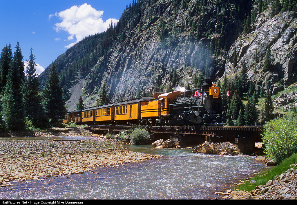 A Durango and Silverton Narrow Gauge train crosses the Animas River just south (east) of Silverton, Colorado, on August 24, 2003. Mikado No. 473 is repainted “Grande Gold” in historic and colorful 1950s movie paint for the 2003 edition of D&SNG’s Railfest, celebrated each August.