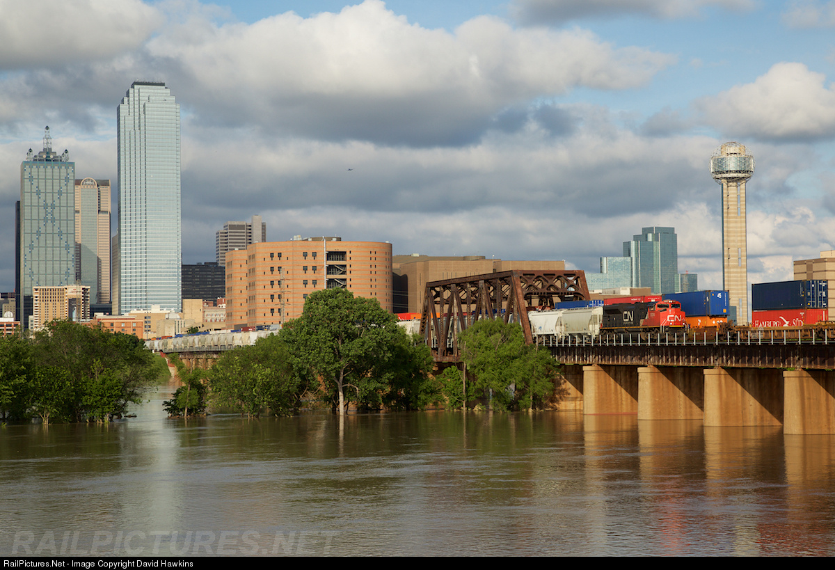 CN leader on a westbound UP rock train to Midlothian Texas crossing the flooded Trinity River.