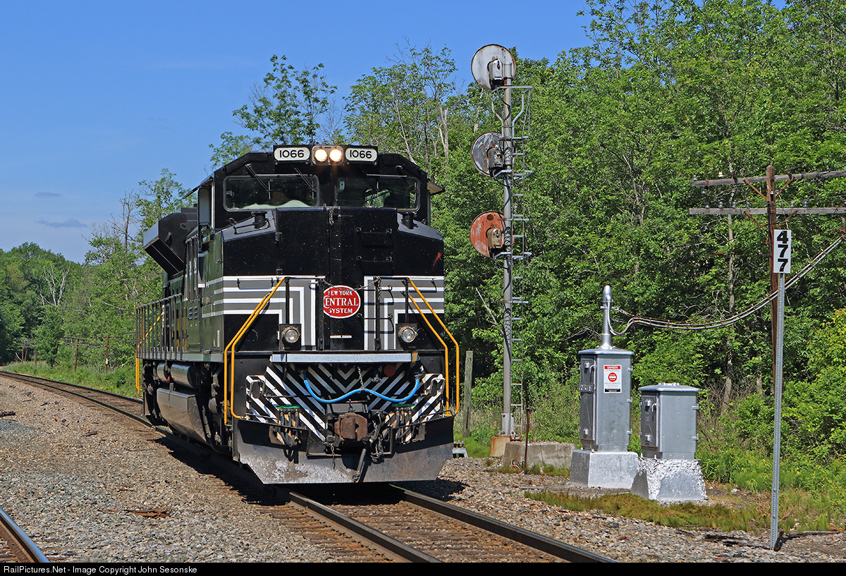 The New York Central heritage unit passes MP 477 and the classic D&H searchlight at CPF-477. The 1066 is the sole power for CP 939- NS 206, Mechanicville, NY to Chicago intermodal. Since the unit was facing LHF it is being turned on the wye at this location. An additional unit will be added at Buffalo.