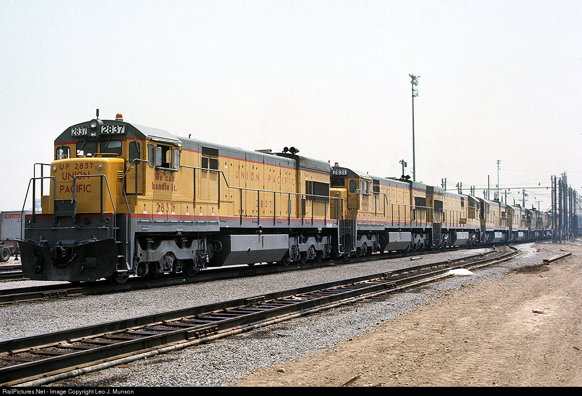 Found in Union Pacific's East Yard, just southeast of downtown Los Angeles, is an impressive string of fairly new U30Cs. 2837 was built by General Electric in March of 1973, just three months before this shot on a typical "June Gloom" overcast June 23rd, 1973.