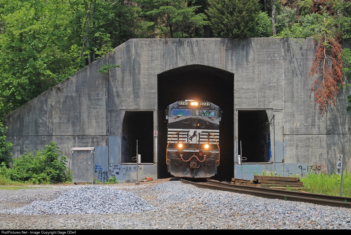 | Southbound Triple Crown train, NS 251, pops into the afternoon sun as it comes out of Nemo Tunnel |