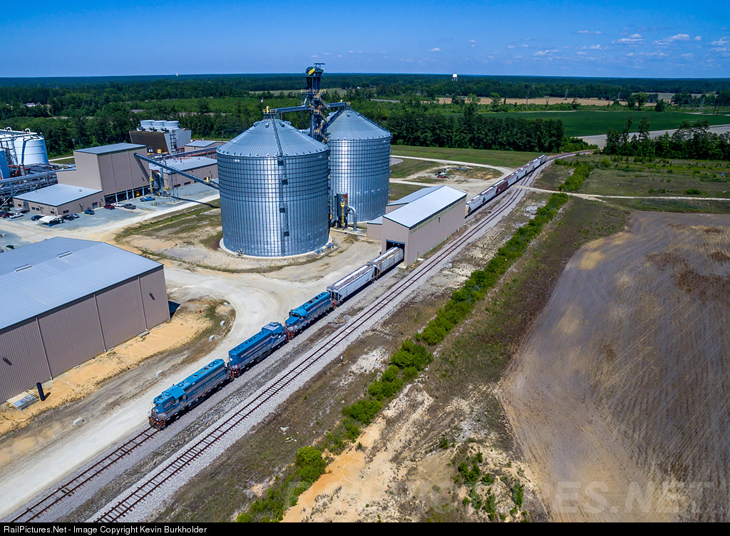 | 1/3rd of Aberdeen & Rockfish Railroad's locomotive roster - GP7 #205, CF7 #2486 and GP18 #300 - are seen working the unloading building for corn at the Tyton NC Biofuels ethanol biorefinery located in Raeford, North Carolina. The facility intends to showcase the use of energy tobacco as a feedstock for ethanol production with minimal modification in a corn dry mill ethanol facility. Tyton NC Biofuels will initially start its operations using corn as the primary feedstock with Aberdeen & Rockfish delivering more than a dozen cars daily for unloading and it will transition to Tyton energy tobacco as more acreage is placed under cultivation. The biorefinery will demonstrate to the existing ethanol industry the favorable economics that result from the use of Tyton energy tobacco derived sugars, and demonstrate to farmers the opportunity in growing Tyton energy tobacco. (the information on the facility is direct from the Tyton NC Biofuels) |