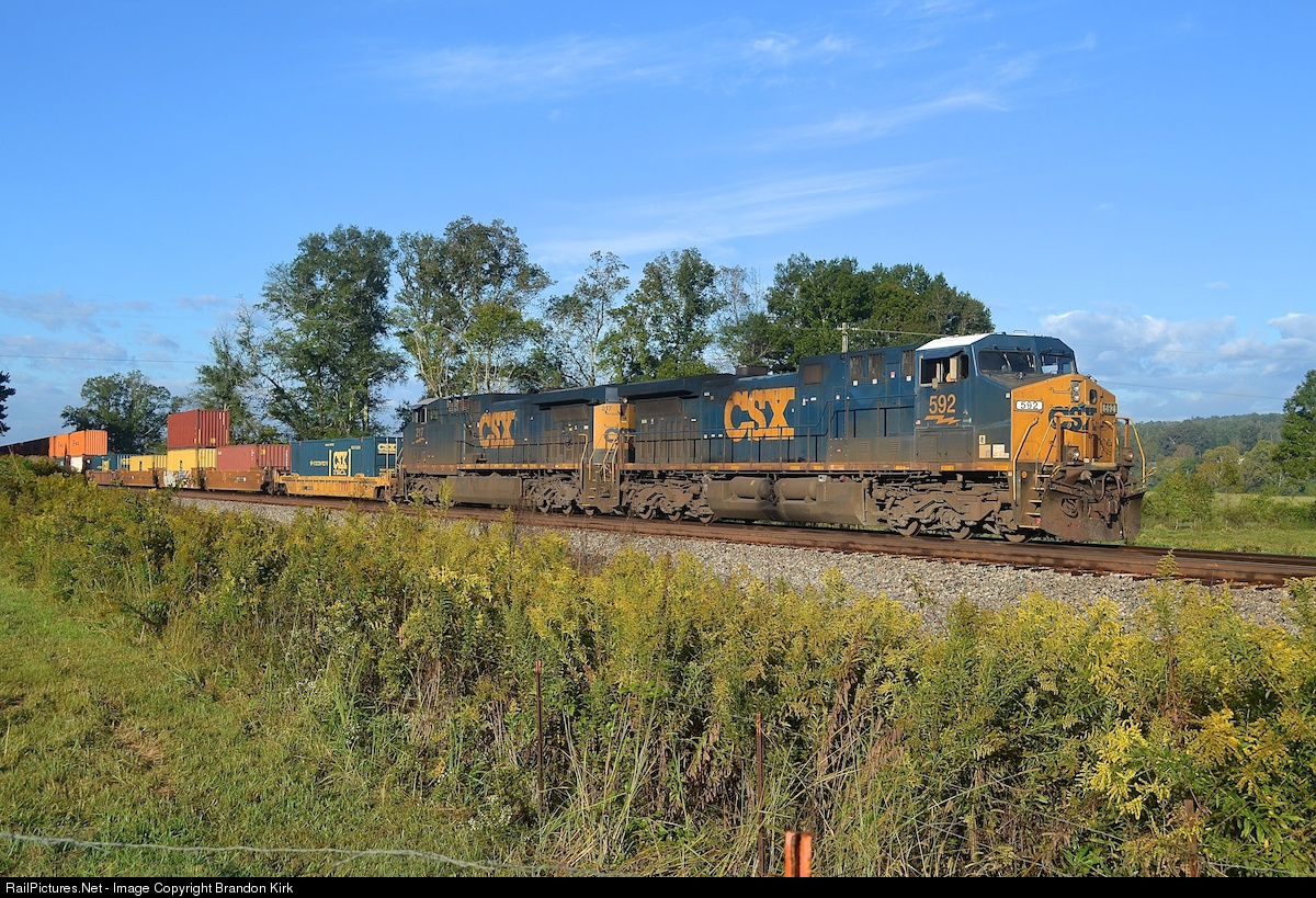 | A pair of CSX AC4400CW No. 592 and No. 217, are in charge of this southbound container train at the southend of Broughton. The crew onboard has ran out of time and is waiting for a PTI van to pick them up. |