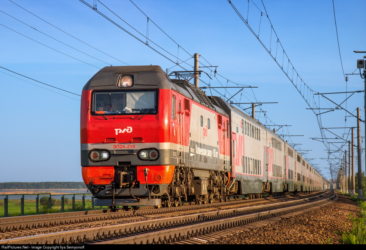 Double-decker train "Saint Petersburg - Moscow". EP2K locomotive with passanger double-decker train goes on the mound through the reservoir near Zavidovo station at the south of Tver region. Since last year Russian Railways actively introduce and implement the double-decker trains. In coming years Russian Railways will plan to replace all second-class carriage by the double-decker trains to improve passenger comfort. The price that will remain the same because of the increase number of places in double-decker.