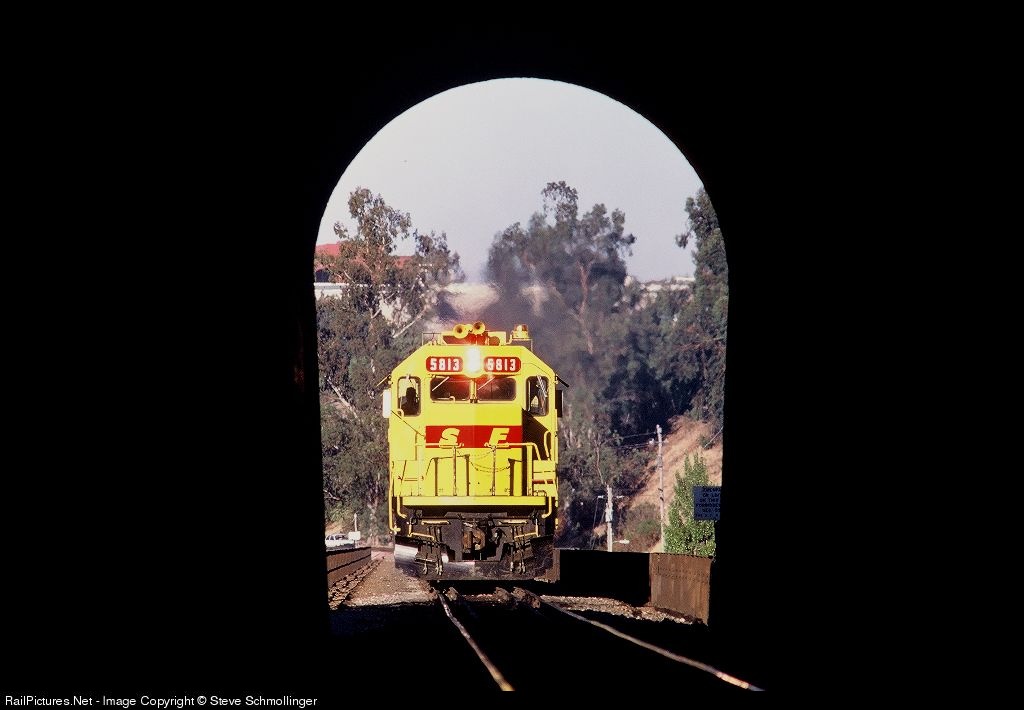 | Santa Fe 5813, with an SD45-2 in SPSF "Kodachrome" merger paint, approaches the east portal of tunnel 2. |