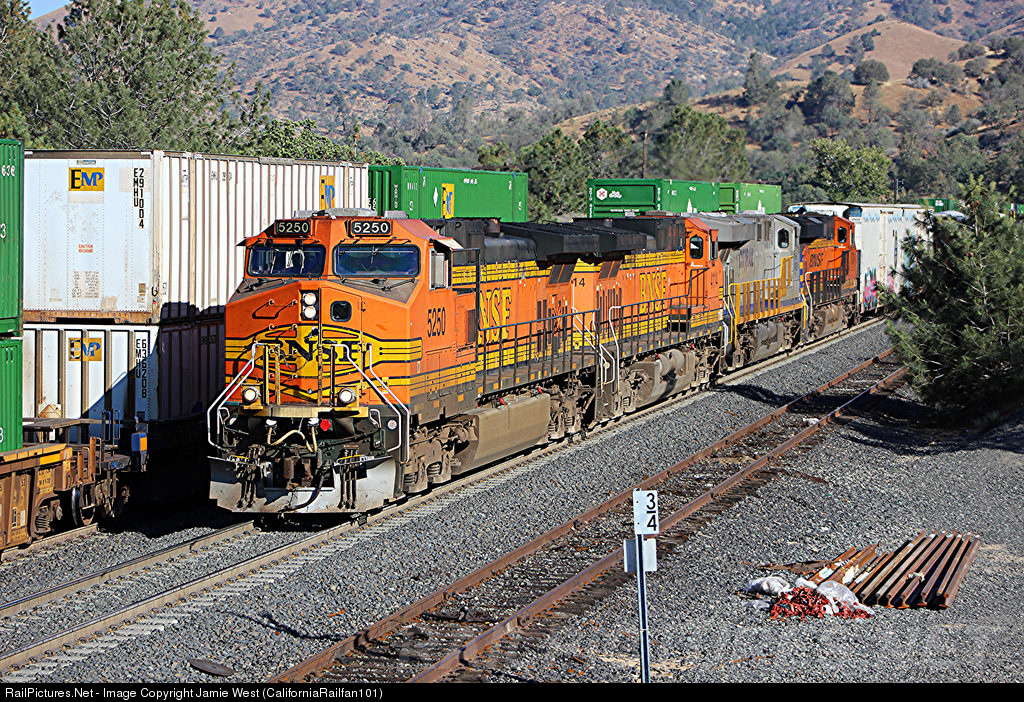 | A BNSF manifest decends Tehachapi Pass at Woodford led by C44-9Ws #5250 and #4114, CitiRail ES44AC #1429, and ES44C4 #6734. |