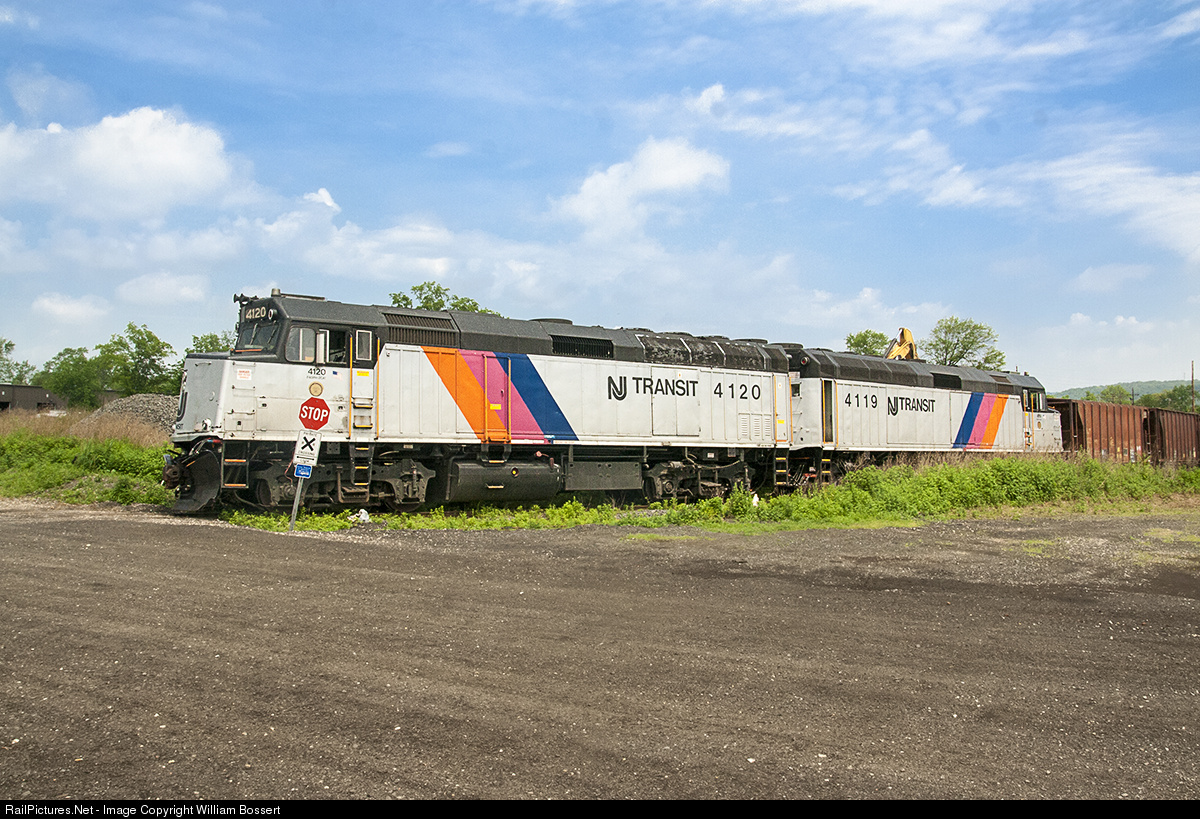 A pair of the remaining active New Jersey Transit F40’s (4120 & 4119) shown parked at the industrial spur near Bridgewater NJ that connects off NJT’s Raritan line after shoving hoppers to receive ballast and stone from the quarry off the spur.
