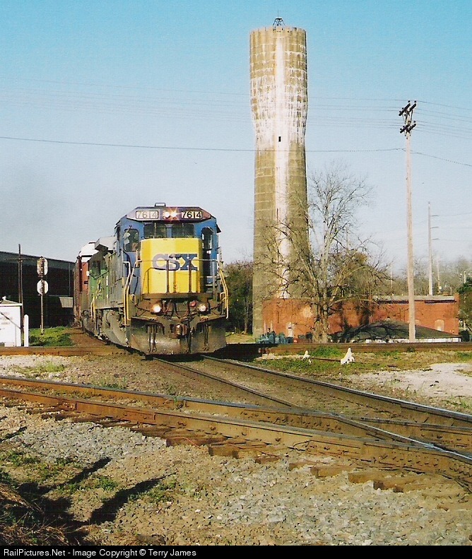 | In this scene, CSX 7614 is pounding one of Cordele's diamonds. In the background, the viewer will note a unique concrete water tank. |