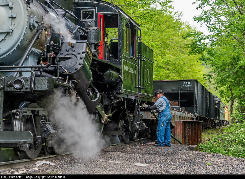 Water Stop: Elk Creek One of the unique features of the Durbin & Greenbrier Valley's excursions on the old C&O Durbin Branch is the water stops. Unlike most steam tourist lines, which take water from a tank or fire hose, the "Durbin Rocket" draws its water from a local creek, just as geared engines regularly did a century ago. In this photo, Engineer Earl Knoob attaches a large rubber suction hose to his engine's steam siphon. Working in a fashion similar to the injectors on the locomotive, the steam siphon uses a jet of steam to create a suction and literally draw the water all the way from the creek bed to the top of a standpipe on the tender tank. A metal screen on the other end of the hose prevents plant debris and other foreign matter in the water from contaminating the locomotive's cistern. The process is not fast. It literally takes about half an hour to fill the tank on this 55-tonner. Another consideration is that the process warms the incoming water, as you might imagine. As the temperature of the water in the tank increases, so too does the difficulty in getting the locomotive's injectors to draw it into the boiler. The water temperature issue is most pronounced during the mid-summer months.